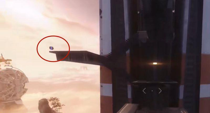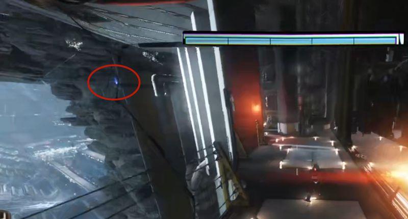 4、落地后沿着左侧行进,经过一个电弧装置打开的门后,在前方建筑物顶端。