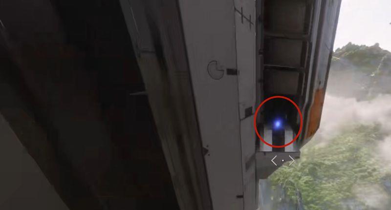 1、跳到敌舰后,在右侧机翼的凹槽中。