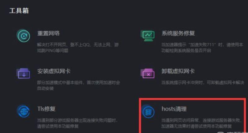3、如果hosts文件被损坏也会导致这样的现状,玩家在加速器工具箱里就可以对hosts文件进行清理。