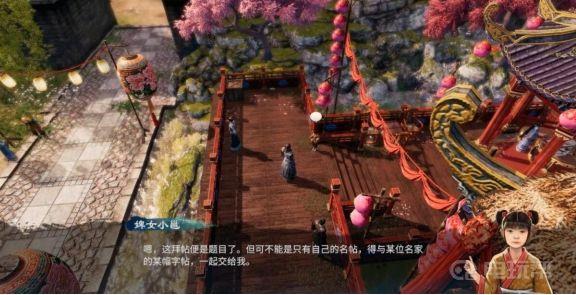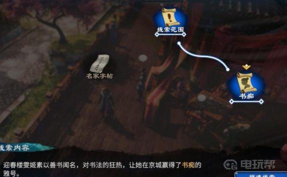 5.再次与门口的虔婆对话进入质问环节。质问环节选项选择顺序为:【随便聊聊】—【激将之计】—【雯姬到迎春楼来多久了?】—【七岁就能作诗 ?】—【谈论八卦】—【只对老先生发表意见】—【雯姬如何习字?】—【雯姬学艺的老先生】。