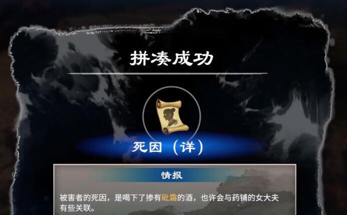 16.拼凑成功后,获得情报『死因(详)』,同时得知被害人近来因为用药材酿酒一事和药铺女大夫起过争执,女大夫有作案动机。