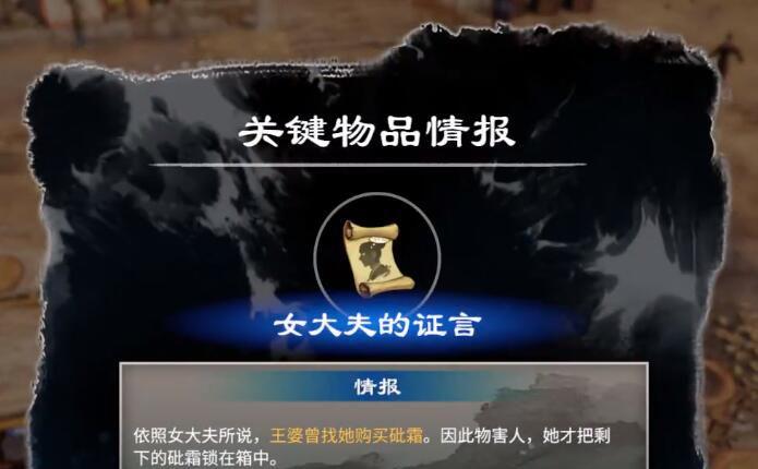 22.再找刚才的女大夫出示关键物品情报『砒霜』,和其对话后得到新的关键物品情报『女大夫的证言』,发现王婆也有很大嫌疑。