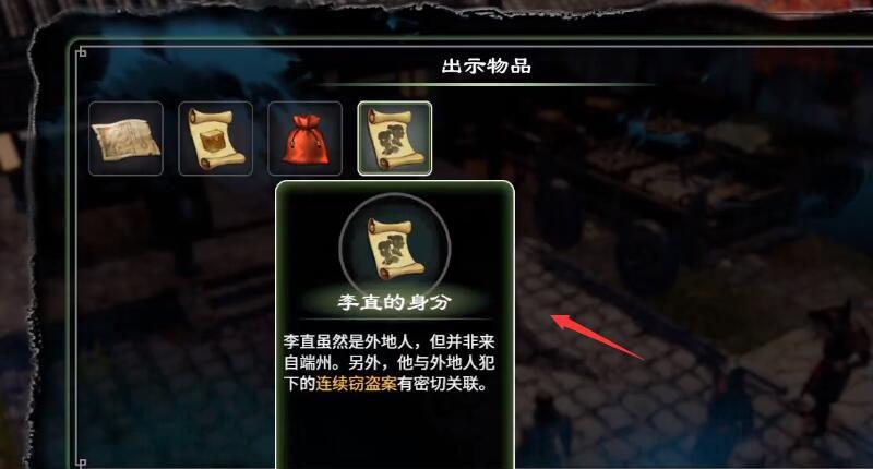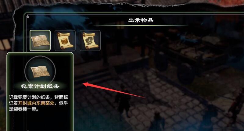 22.回过头『李直』,却发现他已经不在了,在他刚才所在的位置处随便转几步,可发现地上的小纸条,获得关键物品情报『犯案计划纸条』,这应该就是『李直』不小心遗落的,这个情报提示接下来要去迎春楼探索了。