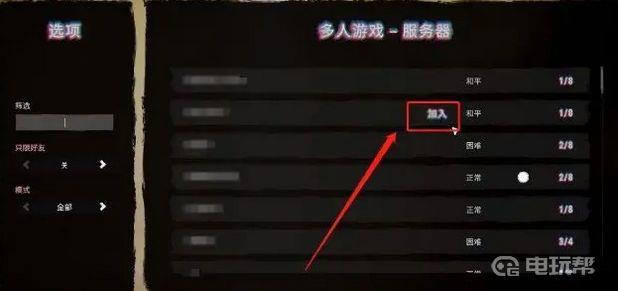 2、就会跳转到游戏大厅界面,可以在左边的“选项”处进行房间的筛选,之后在右边的“多人游戏-服务器”,滑动页面,选择想要加入的房间,点击右侧的“加入”按钮就可以进入房间联机了。