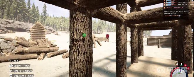 6、之后我们接着砍半截木头,找到屋子的四个角两边都摆上承重柱。