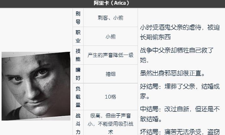 阿里卡人物介绍:小时受酒鬼父亲的虐待,被迫长期偷东西。战争中父亲却牺牲自己救了她,虽然出身邪恶却很正直。