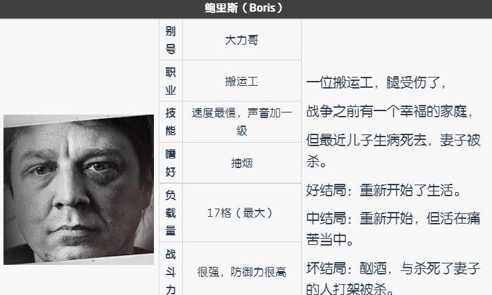 鲍里斯人物介绍:一位搬运工,腿受伤了,战争之前有一个幸福的家庭,但最近儿子生病死去,妻子被杀。