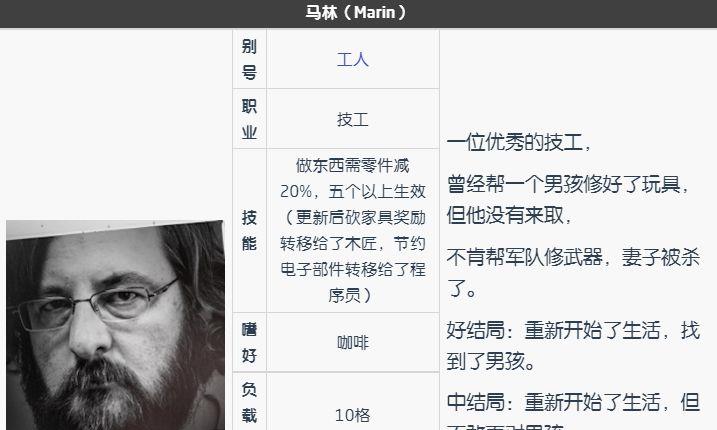 马林人物介绍:一位优秀的技工,曾经帮一个男孩修好了玩具,但他没有来取,不肯帮军队修武器,妻子被杀了。