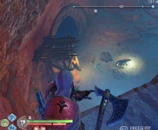 再继续往下,在爬上岩壁后站在洞口往后看,发现那边有【传奇宝箱】和钻地小蜥蜴。
