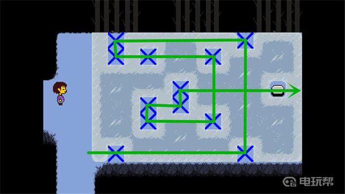1、冰湖东面是papyrus的第一个谜题,四方场地内是带有电的,只有找出唯一一条正确路径才能安然通过。sans提议让你头顶圆球来增加难度,懵然不知弟弟用意的papyrus同意了,他就会进入四方场地走一趟并且留下了脚印,这时候跟随他的脚印行走即可。