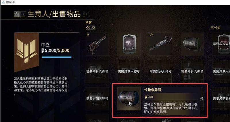 5.点击浏览货物,找到我们需要的长卷鱼鱼饵,需要200声望值就可以换取。