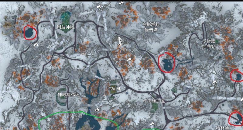 6.换到长卷鱼鱼饵,我们就可以去金星平原的湖泊掉,在温暖状态。(注:红色为池塘,绿色为湖泊)