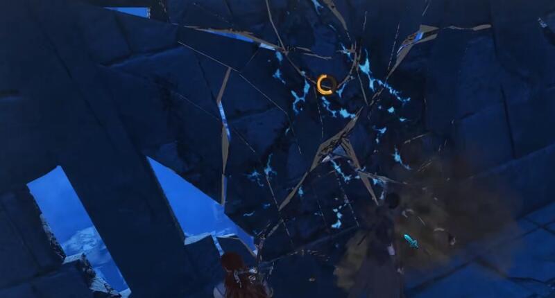 10.跳到台子后转左再跳过两个悬浮石,到达对面平台看到有一个黄色小光圈的石墙,打破这个石墙,就可以出现一条新的道路,所处位置可以参考右上角的小地图。