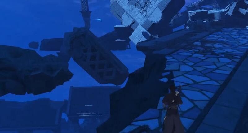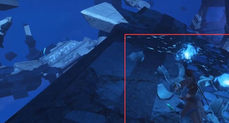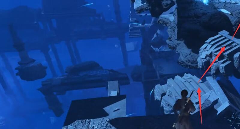 8.过来到另外这个大台子后小走两步,往前跳到这个四方形悬浮块上再往右跳跃到右边这块阶梯状的悬浮石块上。