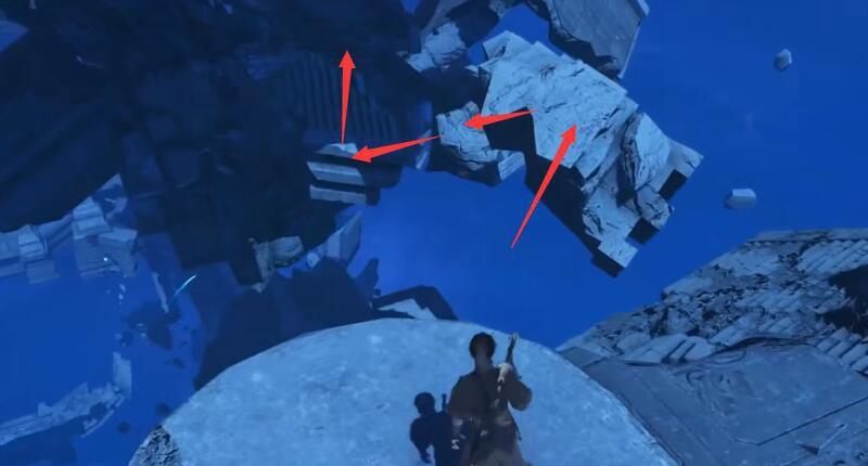 7.到达对面台子后转左几步,到下图位置时,再跳跃踩两块悬浮石到另外一个大台子。