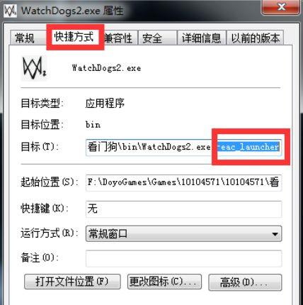2.找到下图watchdogs.exe 空格然后加入" -eac_launcher" 即可顺利进入游戏。