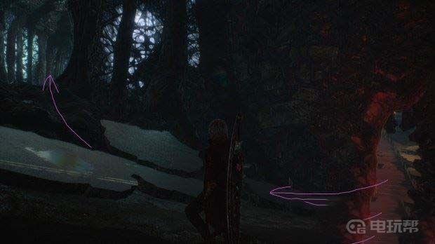 跳下来后根据剧情你会找到白魔魂石所在的位置,在附近的另一个壁架上可以找到紫魔魂石碎片,如下图紫色箭头所示(红色箭头是隐藏关卡的路线)。