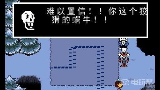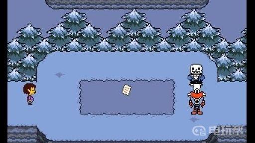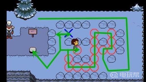 step6.冰湖东面是papyrus的第一个谜题,四方场地内是带有电的,只有找出唯一一条正确路径才能安然通过。sans提议让你头顶圆球来增加难度,懵然不知弟弟用意的papyrus同意了,他就会进入四方场地走一趟并且留下了脚印,这时候跟随他的脚印行走即可。