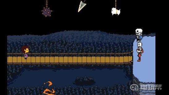 step18.通过吊桥,桥头前见到骷髅行动,papyrus打算使用所有残酷的道具来对付你,可是他三思之后认为这些道具用来对付你都太简单了,所以就放弃了,而且还认为这次是他取得了胜利。