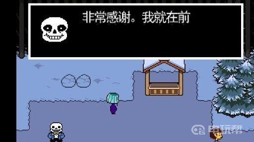 step1.沿着森林往前走,来到一个木桥前会被身后一人叫停,转身后发现骷髅Sans,他希望与你握握手(这个是Toriel日记当中的笑话出现过的情节)。