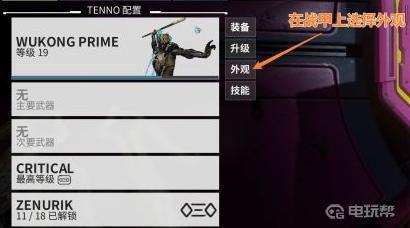 3、把鼠标移动到战甲的位置上,然后在右侧的四个选项中选择”外观“。