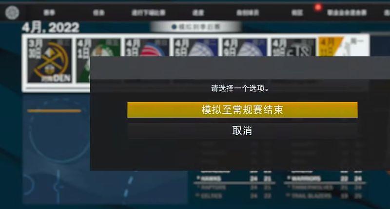3、这是我们就直接模拟到季后赛,当然要确保你的球队战绩必进季后赛再去模拟。(这样基本第一赛季只需要打40/50场就能结束)