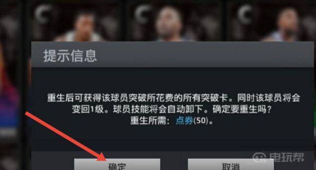 3、点击重生,需要点券,一千点券就是10元,不同品质的球员需要花费的点券不一样,品质越高的球员花儿点券越多,最后再点击【确定】,球员即可重生了,如下图所示: