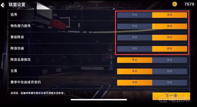 6.把选秀、物色潜力新秀、赛前阵容和伤病阵容都改为自动,点击下一步