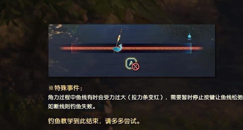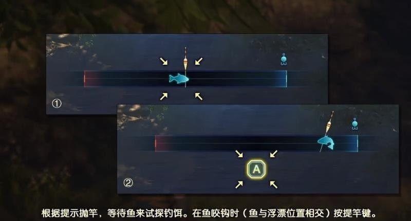 4,钓鱼时会有进度条,当鱼碰到中间的鱼饵就可以按提示的A键或者B键使鱼上钩,控制按键速度把鱼拉到进度条最右侧就是成功。