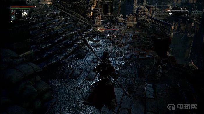 2、穿过教堂右转。(下图)左侧梯子上去开启捷径,位置是刚才遇到敌对猎人的地方。开完捷径,从楼梯返回。穿过旁边的走廊。