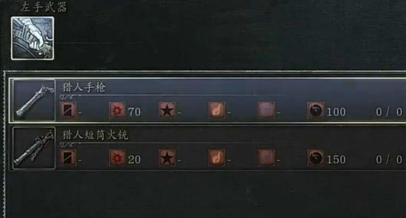 4.然后选择左手武器,左手武器有猎人手枪,还有猎人短筒火铳,这里我们选手枪,手枪的攻速比较高。