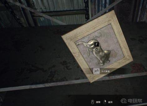 8、在车库的楼梯隔层上找到开客厅的雕像钥匙,旋转相架到背面按下F键取下牛雕像。