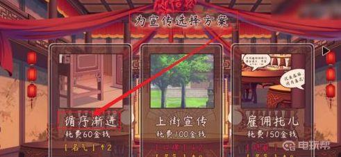 3、最后为灯谜活动选择宣传方案,推荐选择【循序渐进】即可获得名气和口碑提升效果