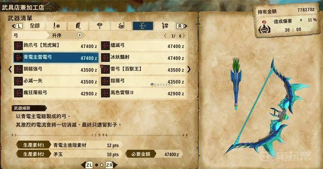 3、而在青电主的武器防具方面,个人不太推荐做青电主的防具,因为技能不实用。而青电主的武器就非常优秀了,比如“青电主雷电弓”直接就把金狮子弓比了下去。