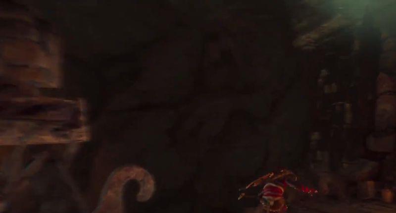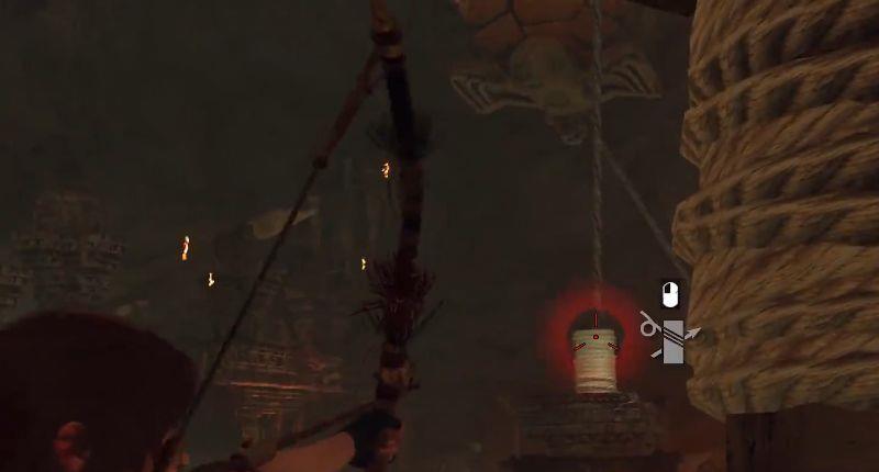 6、因此先从墙壁跳至损坏的摆锤旁。用绳索箭让第三颗摆锤连上第二颗摆锤。