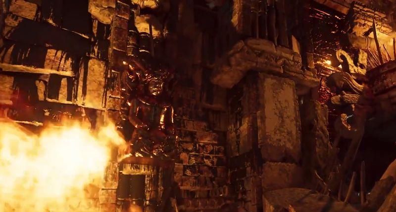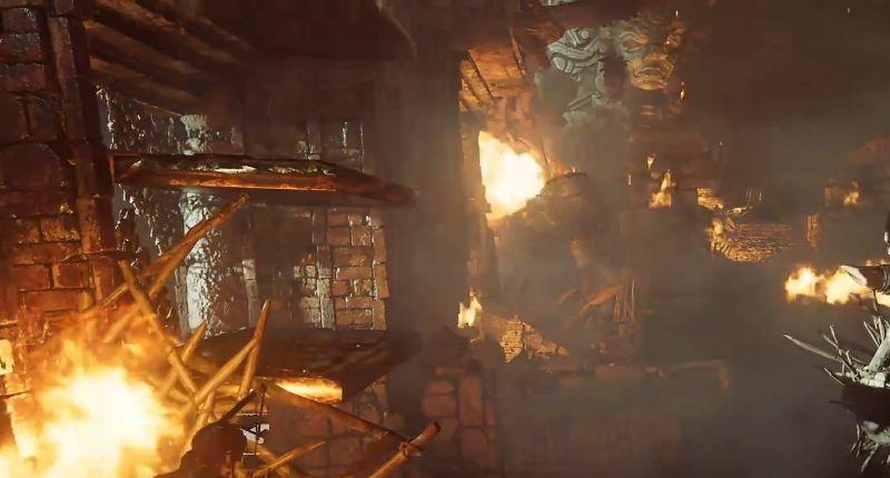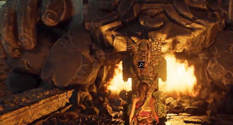 1、循着路往前走,最后便会来到下方这个区域。本座古墓最主要的解法就是必须熄灭中央道路上的火焰。