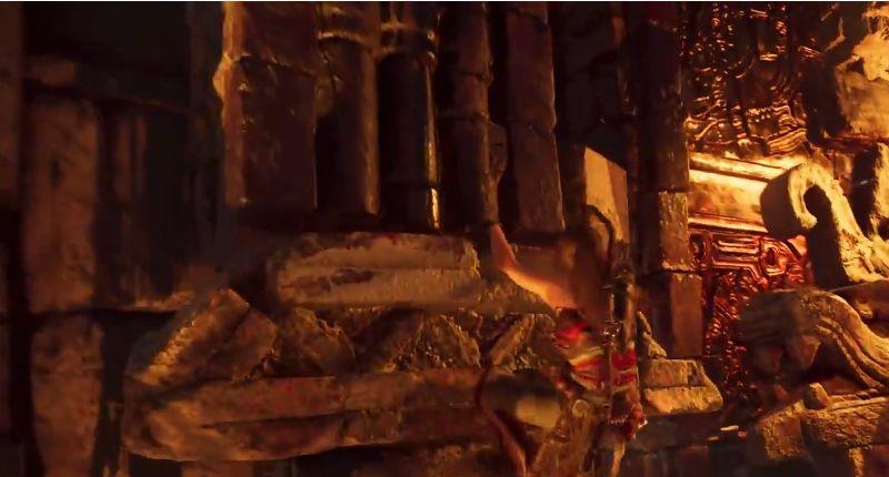 3、左侧区域同样有另一组机关与摆锤(摆锤上有尖刺),此时先推动机关引导气流进入。之后转往右侧路跳至最底端有着火堆的平台。