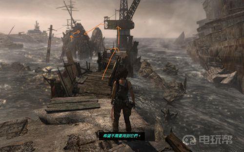 2、滑行到破船之后会触发战斗,敌人会从左右两边平台乘绳索来到我们船上,僵持一段时间之后敌人的机枪手会出现。他用机关枪把固定船的绳索都射断了,我们便要一边爬一边跑躲避炮火,一段时间后整个船崩塌我们被甩到了绳桥上。之后看好子弹时间的时候按shift降落到另一端绳桥上,最后劳拉会落入水中,我们需要在激流中用散弹桥打破障碍物来到海滩。