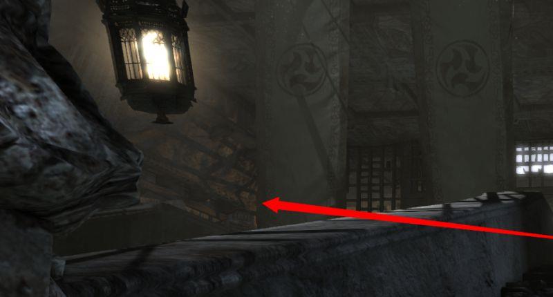 5、到平台后,不要惊动他们,也不要攻击他们。左边围栏缺口处,有个房檐。