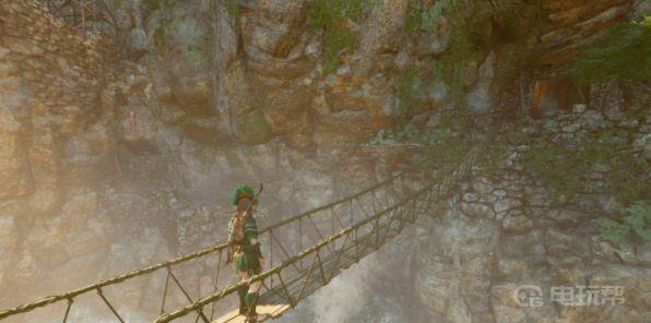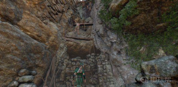 4、返回到之前的那座吊桥前。穿过乌努拉图走过的吊桥,在对面吊桥左侧可以从悬崖往左攀爬,然后攀下仰角岩壁,索降并摆荡到左侧高台。