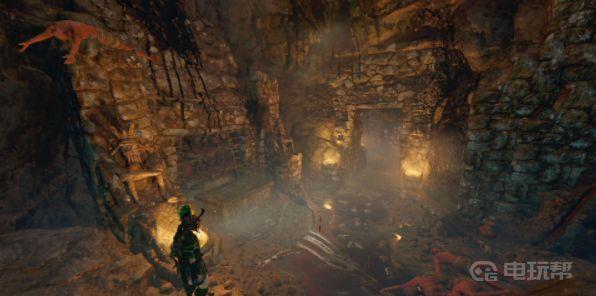3、凿开前方墙洞,用绳索箭矢搭起一条滑索,并沿滑索滑到对岸高台,向左攀爬,按近战攻击键先不忙跟着乌努拉图往前走。往后也有一个吊桥,通过后来到一间石室。石室右侧石台上放着一个笔记本,查看获得1件文物:“库库尔坎教团”。