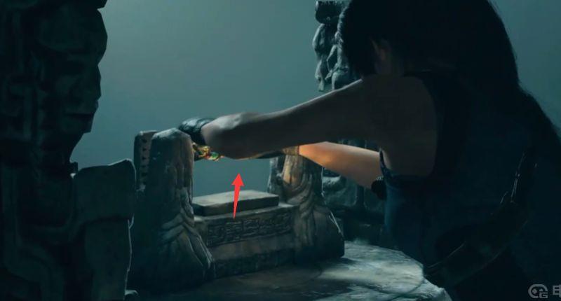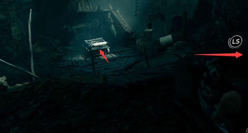 4、来到上面转动这个机关,使小车上的绳索柱正对着我们,用绳索箭矢将机关上的绳索柱与小车上的绳索柱连接。