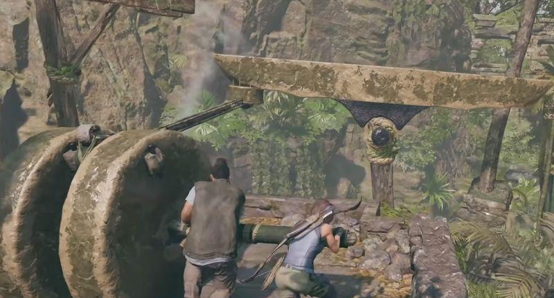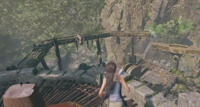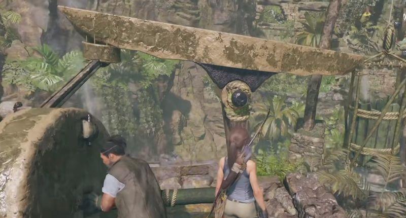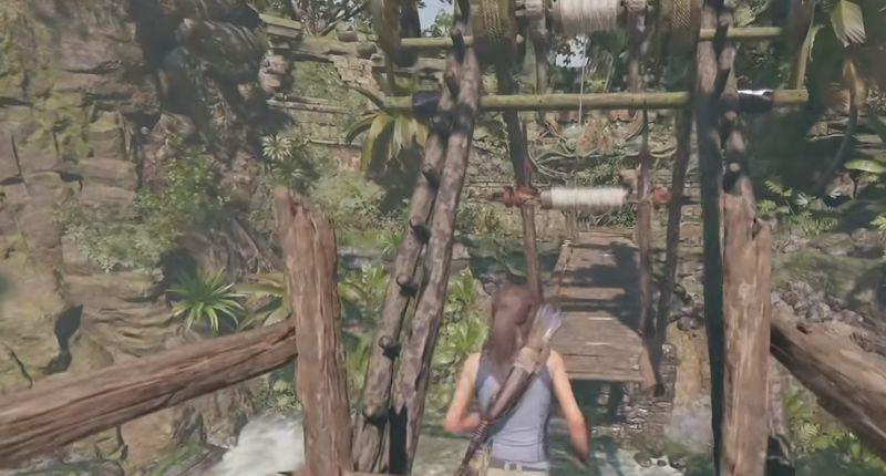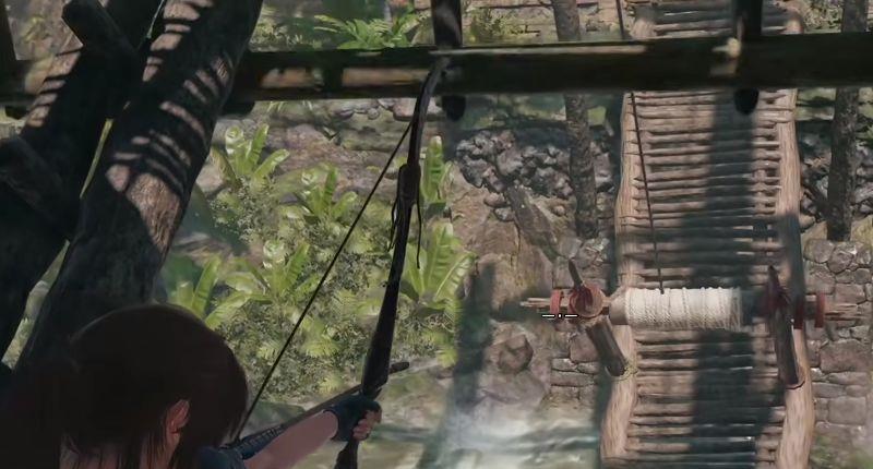 6、因为水流入桶内了,所以滚轮会下来,我们这里用绳索箭射击对面的白条部位,就可以和滚轮连接起来。