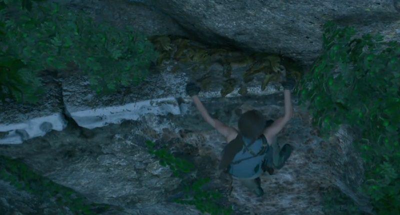 1.攀上左侧岩壁,按跳跃键后再按攀爬键,移至底部。此时在攀爬岩壁状态按一下(不用长按)瞄准键或射击键(鼠标左键),劳拉会用钩斧挂住岩壁放出绳子,用上下方向键控制劳拉是往下降还是往上爬。此处让劳拉降到最下方,按攀爬键放开绳索跳下,落在了下方平台上;