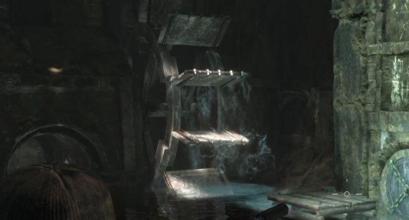 1、蓄水池藏在一个地底过道里,需要先把上方的一块原木打下来,让它砸开洞穴门。进入时候这里注意一下,在两个齿轮的间隙跳下水,否则会被刀片割到。