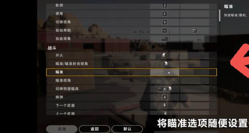 3、进入按键设置,将瞄准选项随便设置一个按键,将瞄准视角设置为右键,点击应用即可。