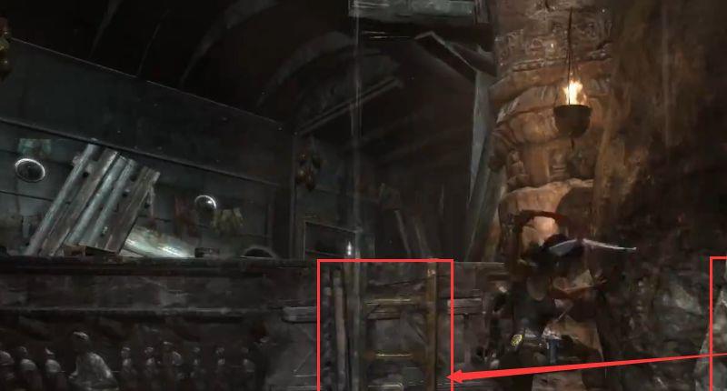 4.在右边墙壁平台上有一只,用绳箭往前拉动圆鼓,让圆鼓将它砸下来,然后把吊在那里的尸体也一并清理掉。