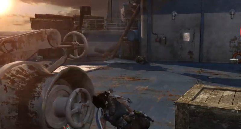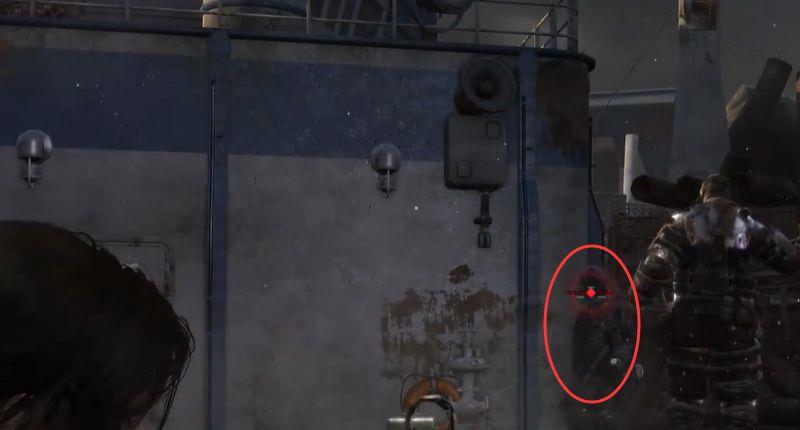 1.峭壁碉堡关卡中,潜伏来到船上甲板时先躲到箱子后面。
