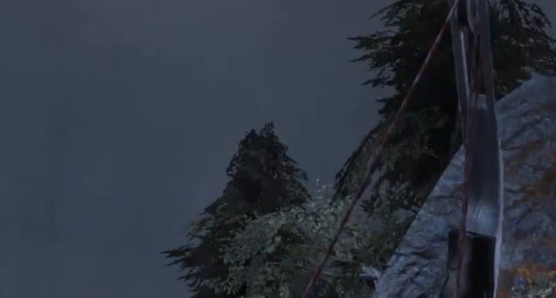7、右转来到悬崖边上,瞄准对面的岩壁射绳索箭,顺着刚做好的绳索,滑到对面。
